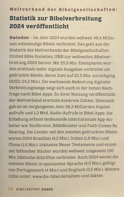 ![]() | Statistik zur Bibelverbreitung 2024 Weltweit wurden fast 49 Millionen komplette Bibeln verkauft - Internet auf dem Vormarsch ... mehr |