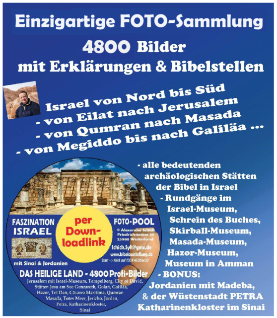 ![]() | 4800 Bilder "FASZINATION ISRAEL" Ein kleiner Überblick das Fotoarchiv "Faszination Israel" 4800 Bilder als download 25.-€ Beide Fotosammlungen Israel & Ägypten zusammen statt 45.-€ nur 35.-€ im Kombipaket | ...Download (7.67 MB) |