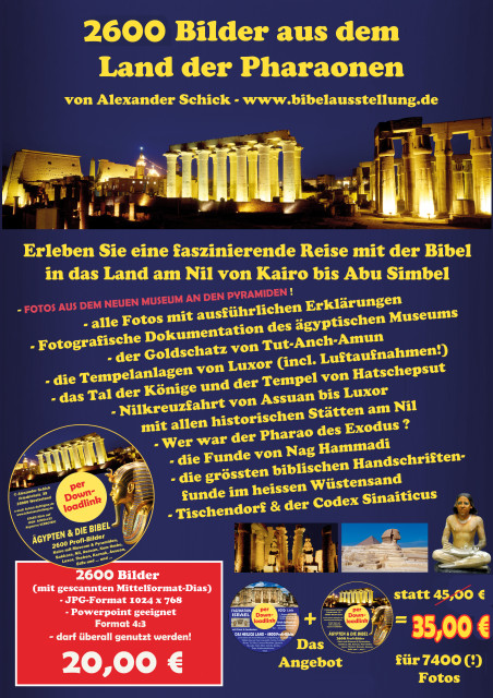 ![]() | Fotosammlung "Ägypten und die BIbel" Fotosammlung "Ägypten & die Bibel" 2600 Bilder 20.- € Beide Fotosammlungen Israel & Ägypten (7400 Fotos) zusammen im Kombipaket statt 45.-€ nur 35.-€ | ...Download (5.92 MB) |