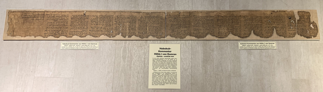 Eine Schriftrolle mit dem Text des Propheten Habakuk (1QpHab) aus dem 1. Jh. v. Chr. wurde ebenfalls in der 1. Höhle entdeckt. Es handelt sich um einen Vers- zu Verskommentar der ersten beiden Kapitel dieses kleinen Prophetenbuches. Auffallend ist der heilige, unaussprechliche Name Gottes „JHWH = Jahwe“, der durch seine althebräische Schrift deutlich hervorgehoben ist (rote Kreise).