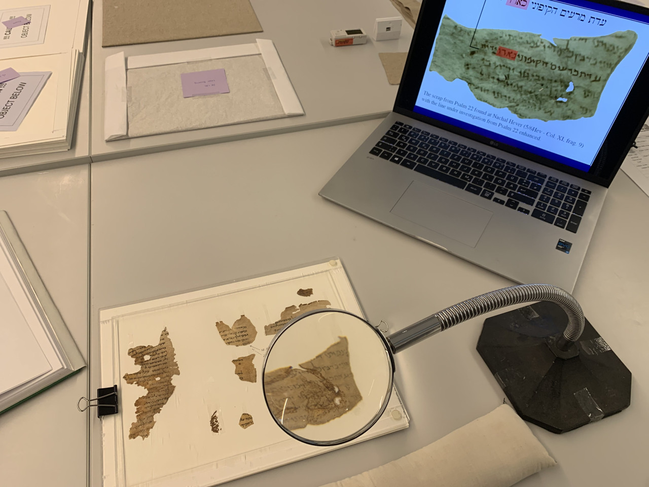 Im Januar 2025 durfte ich das Fragment im Labor der Dead Sea Scrolls Unit der Israelischen Antikenverwaltung in Jerusalem im Original studieren (Foto oben).