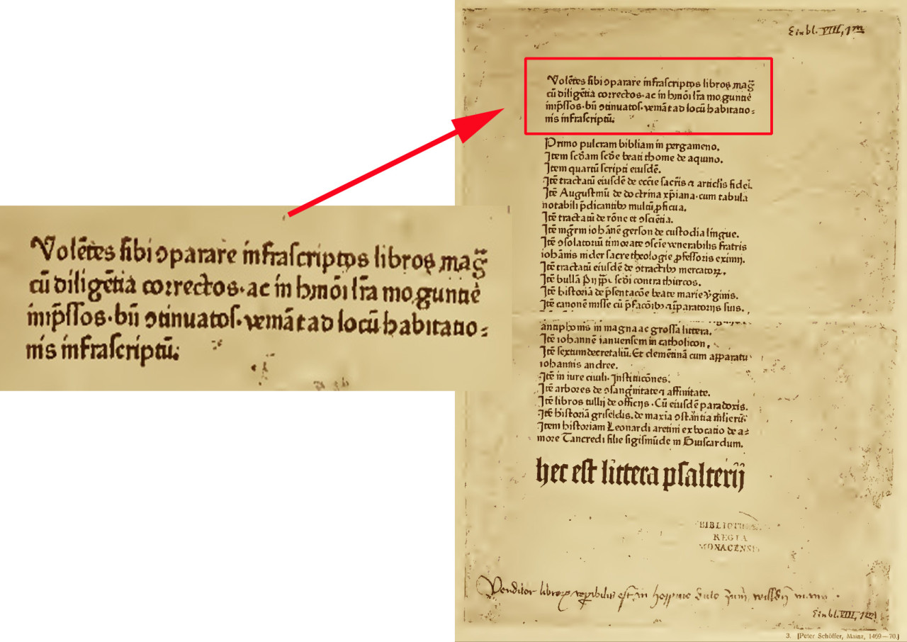 "Alle jene, die sich nachfolgend genannte Bücher kaufen wollen, die mit großer Sorgfalt korrigiert und in Mainz mit Buchstaben dieser Art gedruckt, sowie wohlfeil gebunden wurden, sollen zu dem unten eingetragenen Haus kommen."