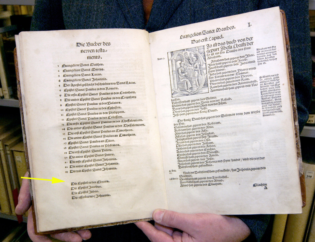 Um die "Wertigkeit" deutlich hervorzuheben, setze er den Hebräerbrief Jakobusbrief Judasbrief und die Offenbarung des Johannes nicht nur OHNE Nummerierung ans Ende, sondern trennte diese mit einer Leerzeile (Durchschuss - siehe gelber Pfeli) von seinen farvorisierten Büchern des Neuen Testaments.