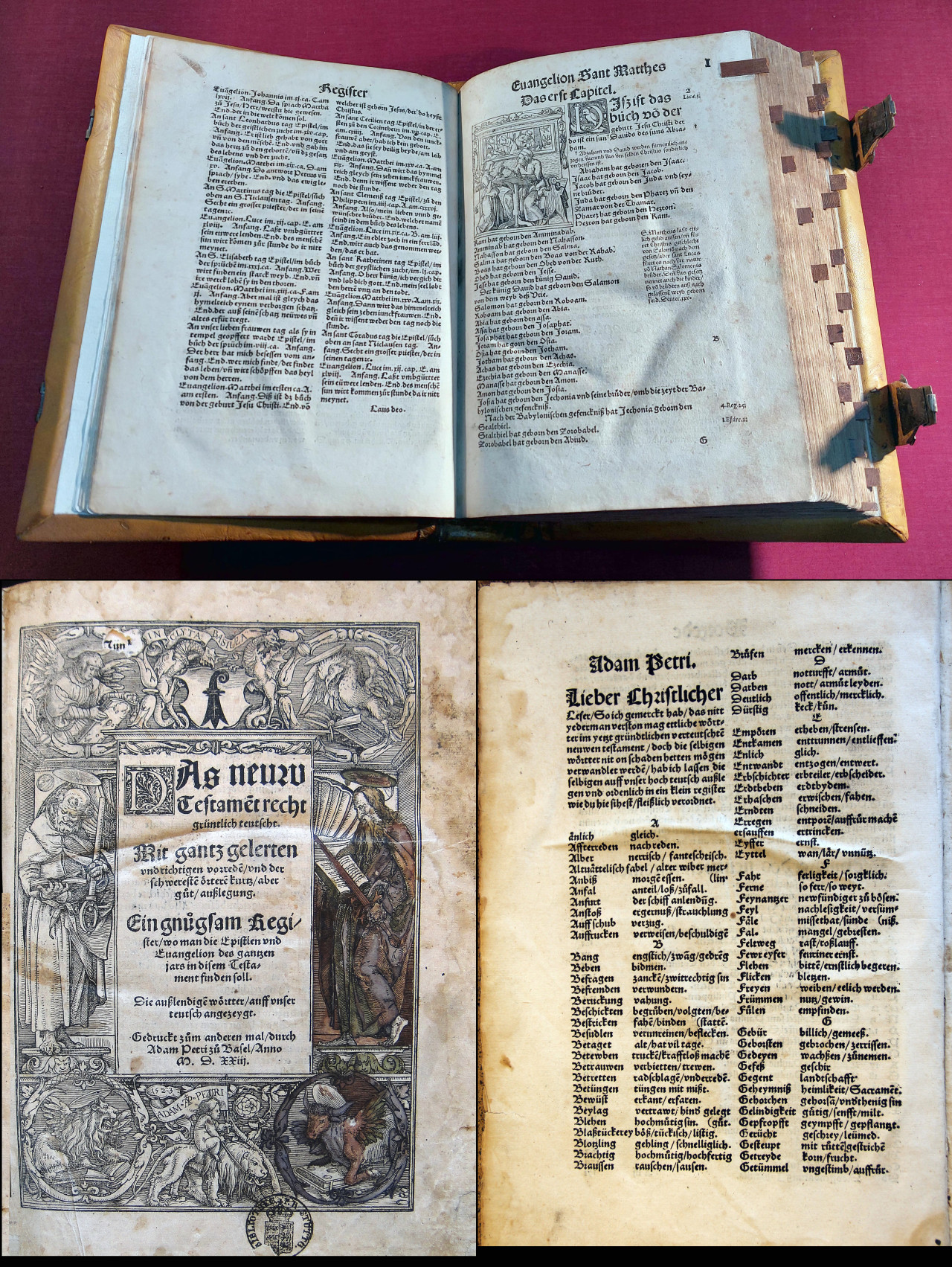 Die Schweizer - Erst wurde nur Luther nachgedruckt1523 Basel Newe Testament Adam Petri![]() Oben: Exemplar aus der Sammlung www.bibelmuseum.ch Unten: Exemplar aus der Bibelsammlung der Württembergischen Landesbibliothek Stuttgart Newe Testament 1523 (1522)Basel Adam PetriDas neuw Testament recht grüntlich teutscht. Mit gantz gelerten und richtigen vorreden, und der schweresten örteren kurtz, aber gut, außlegung. Ein gnügsam Register, wo man die Epistlen und Evangelion des gantzen jars in disem Testament finden soll. Die außlendigen wörtter, auff unser teutsch angezeygt.