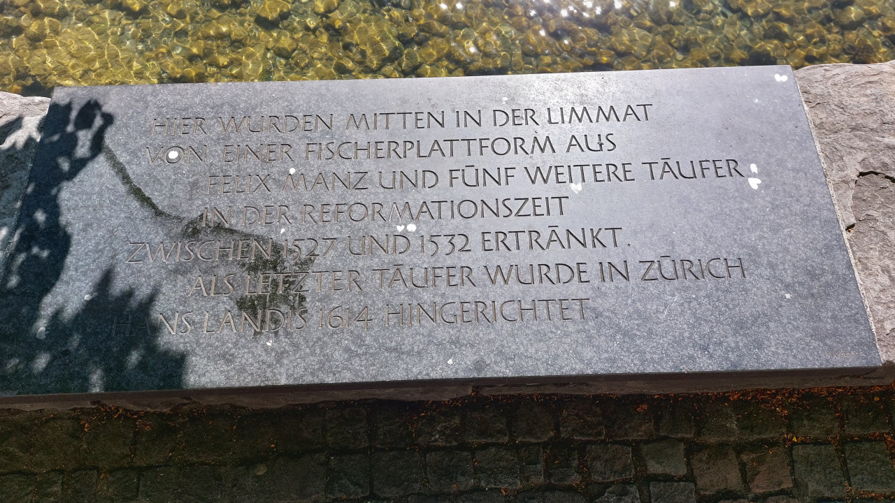 Die Geschichte der Täufer![]() Foto: In Zürich am Ufer der Limat befindet sich an eine Erinnerungstafel an die Ermordung von Felix Mantz im Jahre 1526