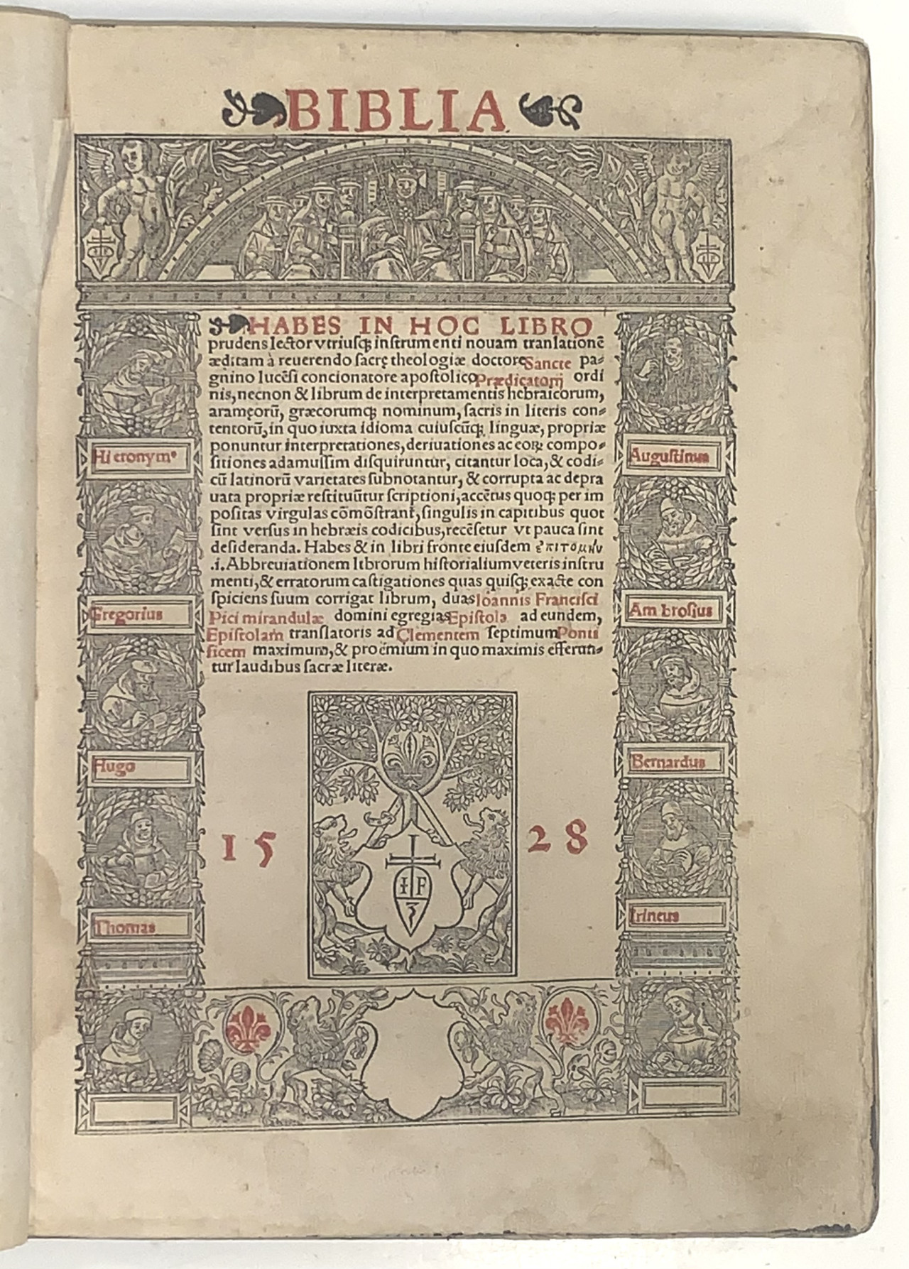 1528 Biblia Latina von Sanctes Pagninus - Grundlage vieler evangelischer Bibelübersetzungen![]() Die lateinische Bibel von Pagninus wird die "Vulgata" der ReformatorenHabes in hoc libro prudens lector utriusq(ue) instrumenti novam tranlatione aeditam a reverendo sacre theologiae doctore Sancte pagnino lucesi concionatore apostolico Praedicatorii ordinis Antoine Du Ruy für F. Turchus, D. Berticinius und J. De Giuntisgedruckt 29. Jan. 1528 in LyonIm 16. Jahrhundert erschienen mehrere neue lateinische Übersetzungen der Bibel aus den hebräischen und griechischen Originaltexten. Die bedeutendste und früheste Version war die des italienischen Dominikaners Sanctes Pagnini (1470-1536), der das Übersetzungsprojekt um 1493 begann. Er war als Lehrer für Griechisch und Hebräisch nach Rom berufen worden. Die Übersetzung hatte er vor 1520 fertiggestellt und zeigte sie in dem Jahr Papst Leo X. Dieser verlangte eine Revision des Textes und sollte auf seine Kosten gedruckt werden. Pagninis Übersetzung wurde 1528 mit Empfehlungsschreiben veröffentlicht, die dem Text Privilegien zusprachen, darunter ein Brief des Renaissance-Philosophen Pico della Mirandola. Diese Bibel von 1528 ist der Erstdruck von Pagninis Übersetzung; eine Version, die für ihre Nähe zu den Originalsprachen geschätzt wurde. Pagnini wurde vom Reformator Martin Luther wegen übermäßigen Literalismus und „jüdischer Gelehrsamkeit“ kritisiert. Diese Nähe zum Hebräischen wurde von jüdischen Gelehrten positiv aufgenommen, die Pagninis Übersetzung als die einzig adäquate christliche lateinische Bibelversion beurteilten. Pagninis Bibel stand bei vielen evangelischen Bibelübersetzungen in die jeweiligen Landessprachen Pate. So bei der Französischen von Olivetan. Und der Text fand Eingang in die Königliche Polyglotte von Antwerpen (1572) in den 7. Teil bekannt als Biblia Pagnini.