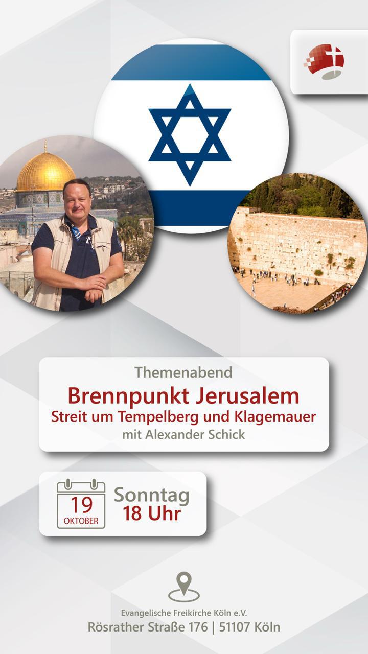 Vortragsstermine - Multimediavorträge von Alexander SchickKÖLN-OSTHEIM / Vortrag: Auf der Suche nach dem Tempel in Jerusalem19.10.2025![]() Der Sylter Bibel- & Israelexperte Alexander Schick wird eine spektakuläre Multimedia-Computershow über den Tempelberg von Jerusalem zeigen, der als 8. Weltwunder der Antike bezeichnet wird. Der Referent hat 30 mal archäologische Studienreisen durch den Nahen Osten und vor allem auch durch Israel geleitet und begeistert durch seine besondere Gabe, die antike Welt der Bibel lebendig werden zu lassen.