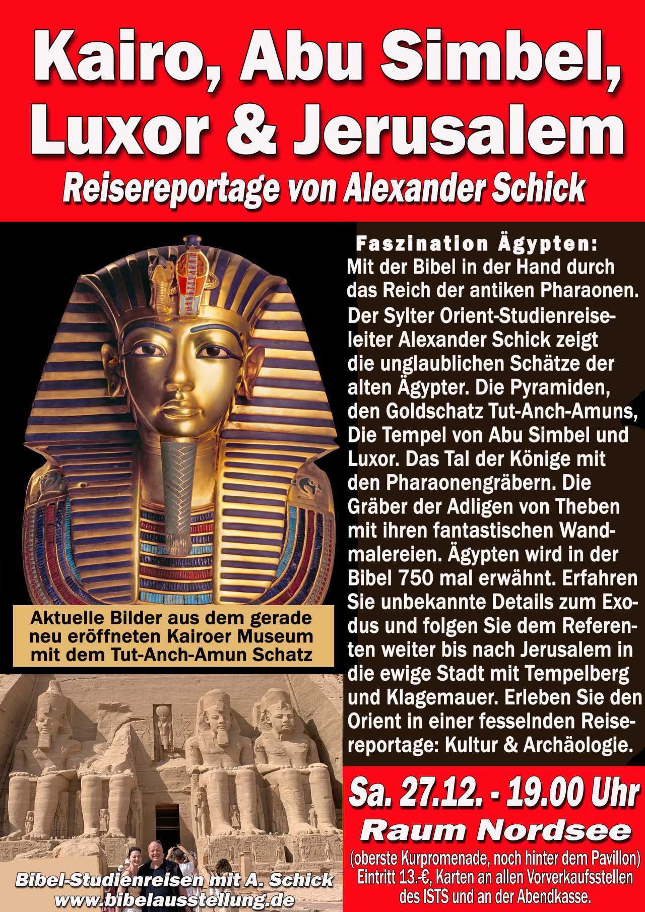 Der Sylter Nahost-Studienreisleiter Alexander Schick ist vor kurzem aus Ägypten und Israel zurückgekehrt, wo er Reisegruppen durch das antike Reich der Pharaonen und durch das Heilige Land geführt hat. Von den vielen Höhepunkten seiner Studienreisen hat er einen informativen Multimediavortrag konzipiert. Samstag 27.12. will Schick die Besucher zu einer virtuellen Reise mitnehmen. So geht es in das inzwischen weltberühmte neue Museum von Kairo mit dem Goldschatz des sagenhaften Pharaos Tut-Anch-Amun, Erst vor wenigen Wochen wurde dieser Flügel des Grand Egypt Museums feierlich eröffnet.